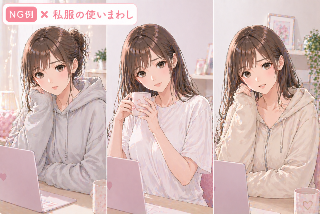 普段、外で着ている私服をそのまま配信で使うのは、身バレのリスクを高めるため絶対におすすめしません。